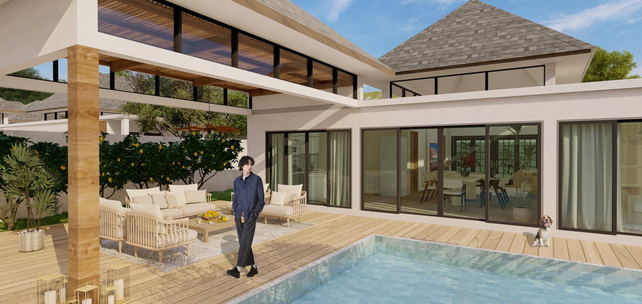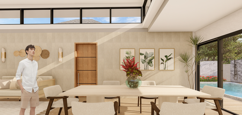 In Ihrer luxuriösen Poolvilla erwartet Sie ein offener Wohnbereich mit moderner offener Küche, in der eine elegante Kücheninsel den Mittelpunkt des Raumes bildet.